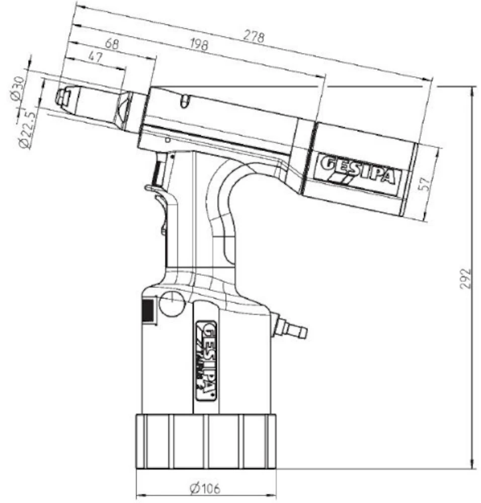 Solide lichtgewicht plaatsingsgereedschap voor blindklinknagels met slagvaste kunststof behuizing. Voorzien van pneumatisch aangedreven bekken en stiftafzuiging.