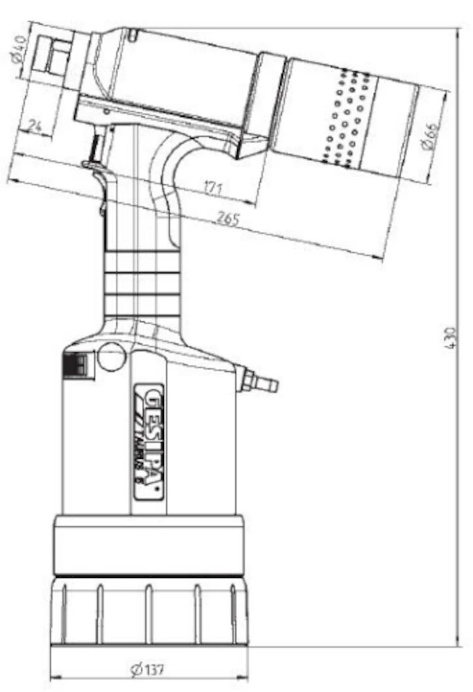 Solide lichtgewicht plaatsingsgereedschap voor blindklinknagels met slagvaste kunststof behuizing. Voorzien van pneumatisch aangedreven bekken en stiftafzuiging.