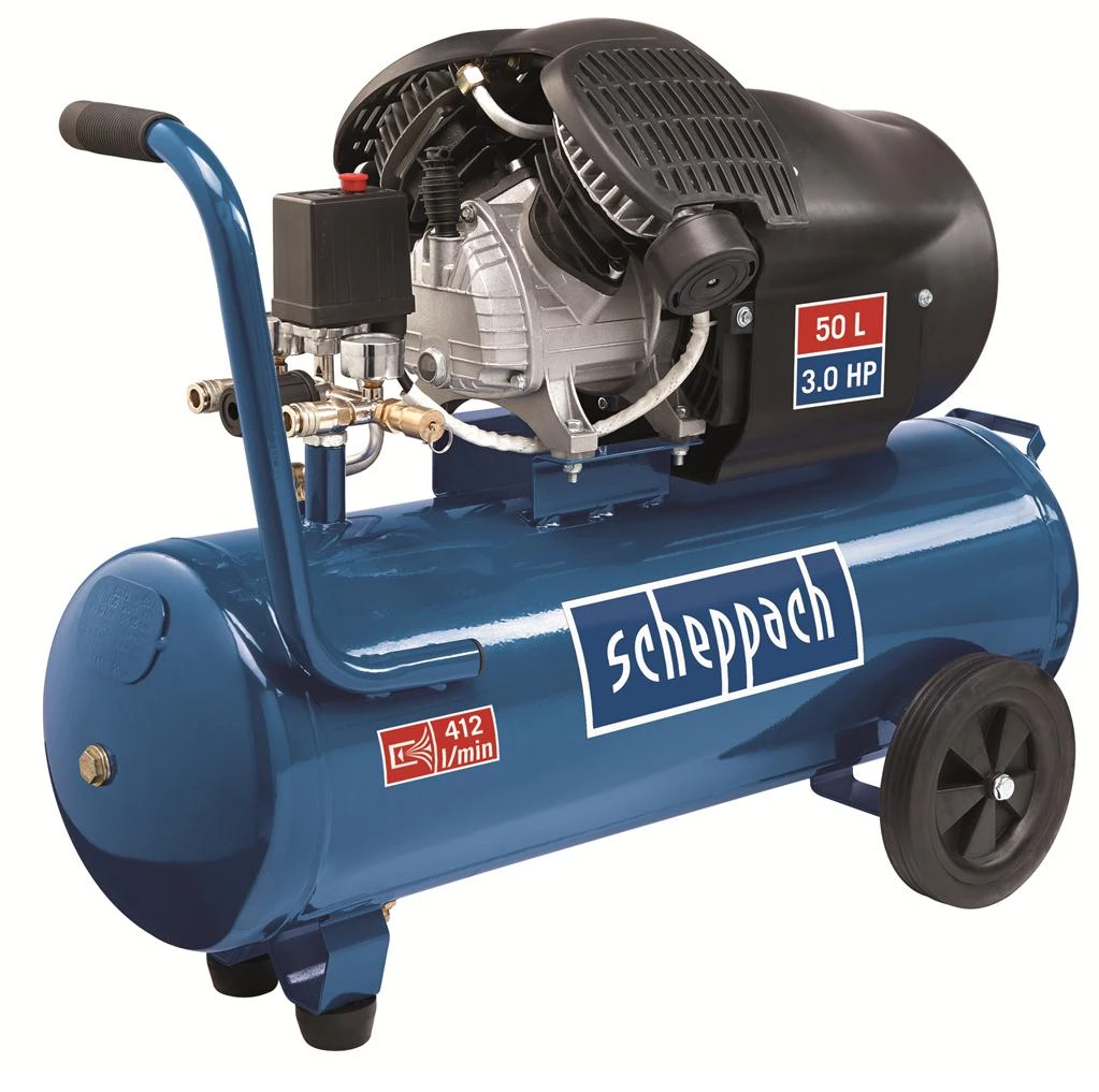 - Compresseur d’air Scheppach HC53DC avec un réservoir de 50 litres.
